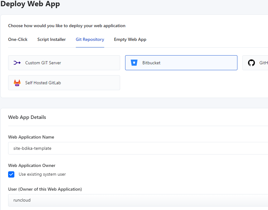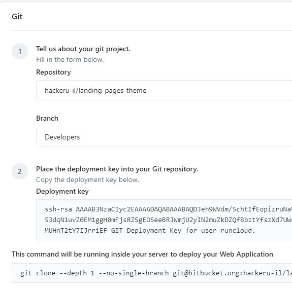 בחלק של ה-GIT מגדירים מה שצריך. את ה-DEPLOYMENT KEY מגדירים ב-BITBUCKET אם הוא לא קיים שם.