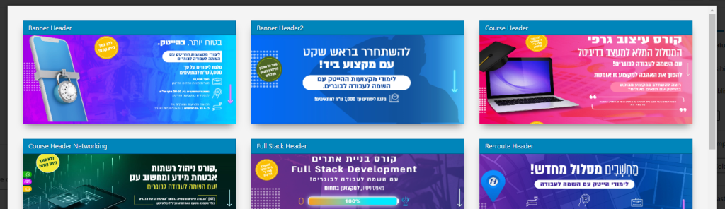 בלחיצה על הכפתור הוספה נפתח חלון עם אפשרויות של בלוקים לבחירה. ככה אנחנו בונים את כל העמוד עם הקומפוננטות שונות.