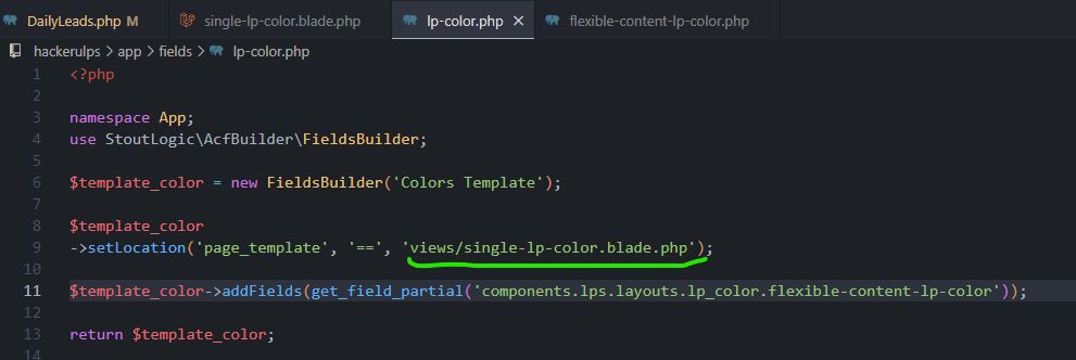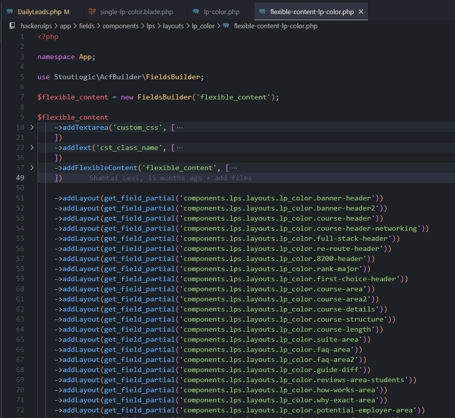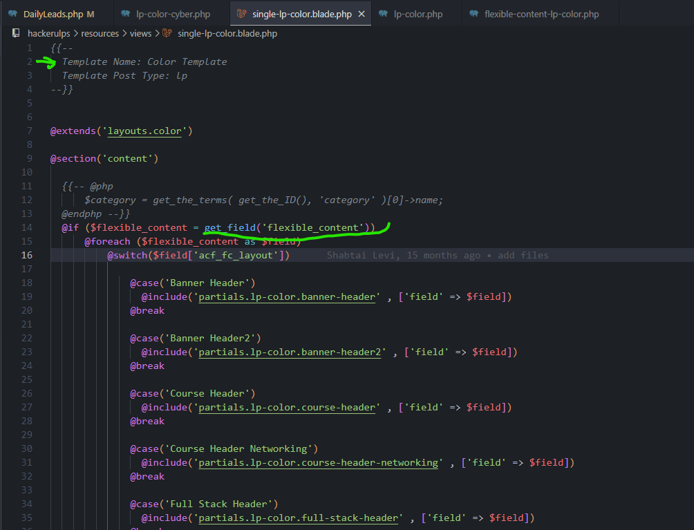 מה שקורה בקוד זה ככה ברגע שבחרנו תבנית COLOR TEMPLATE הקובץ הזה מתחיל לעבוד. ב-get_field('flexible_content') יש לנו את כל הקומפוננטות שבנינו לעמוד ספיציפי.